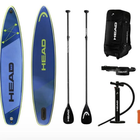 SUP Board | Fiberglas-Carbon Paddel 3-teilig (165-215cm) | Rollenrucksack mit Tragegurte | Bravo Doppelhubpumpe | Coiled Leash | US-Box Finne | Repairkit